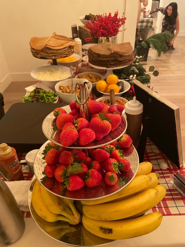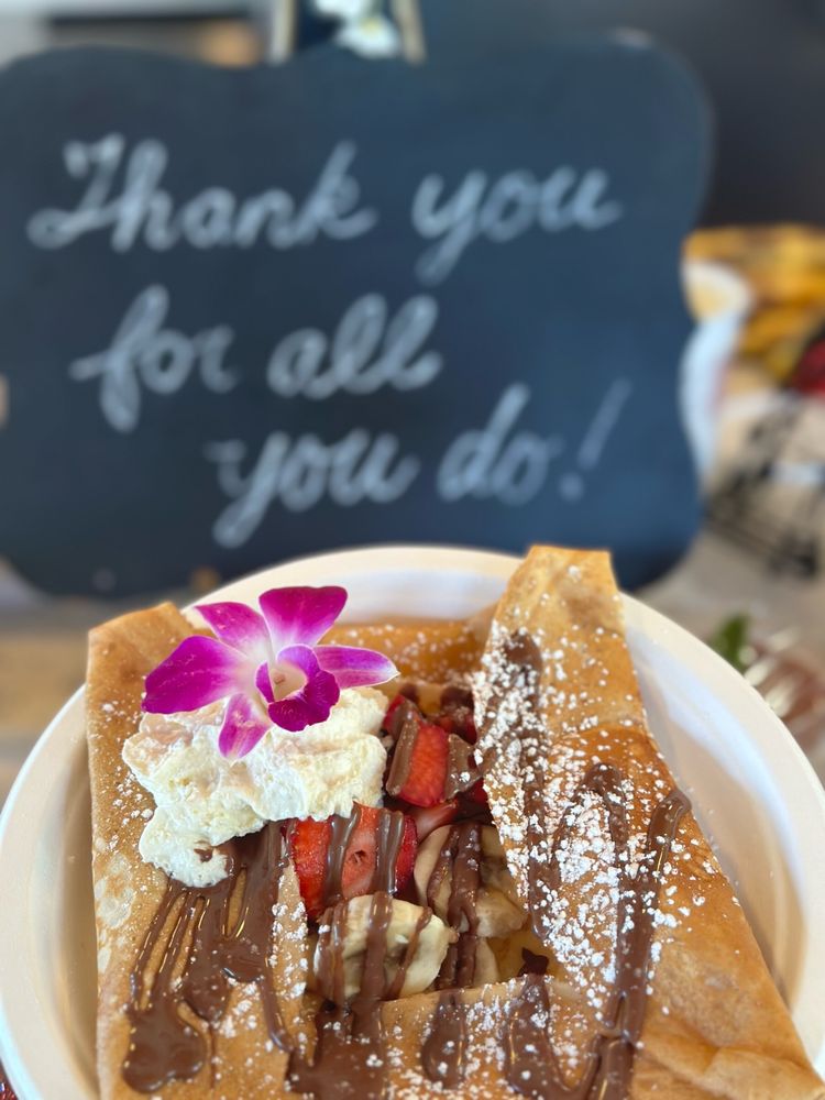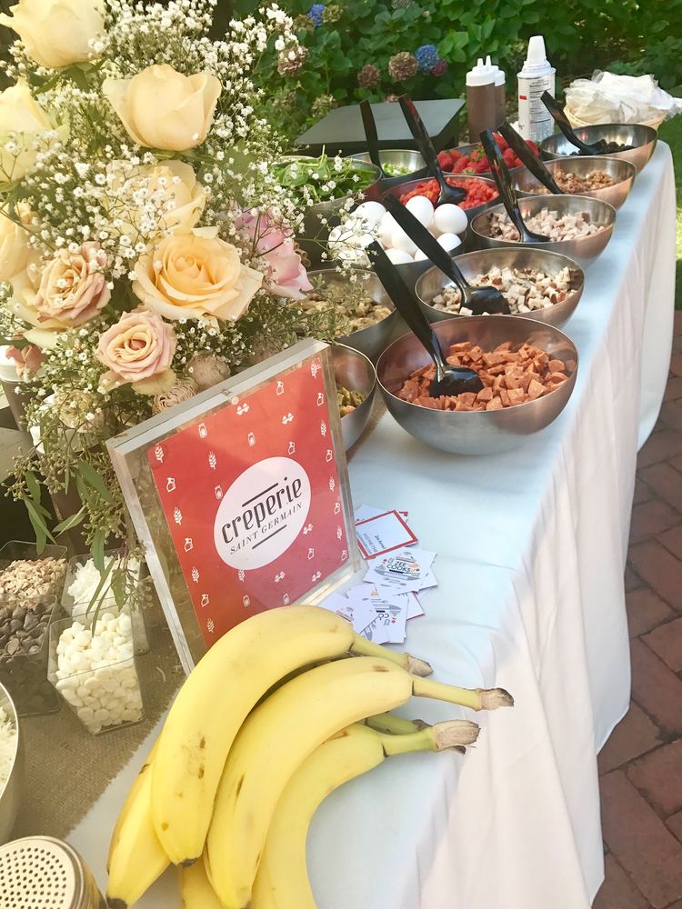 Nutella, sugar, organic honey, fresh lemon, shredded coconut, sea salt caramel banana, strawberries, cinnamon apples, salted butter, graham crackers, toasted almond, marshmallows, whipped cream, powdered sugar